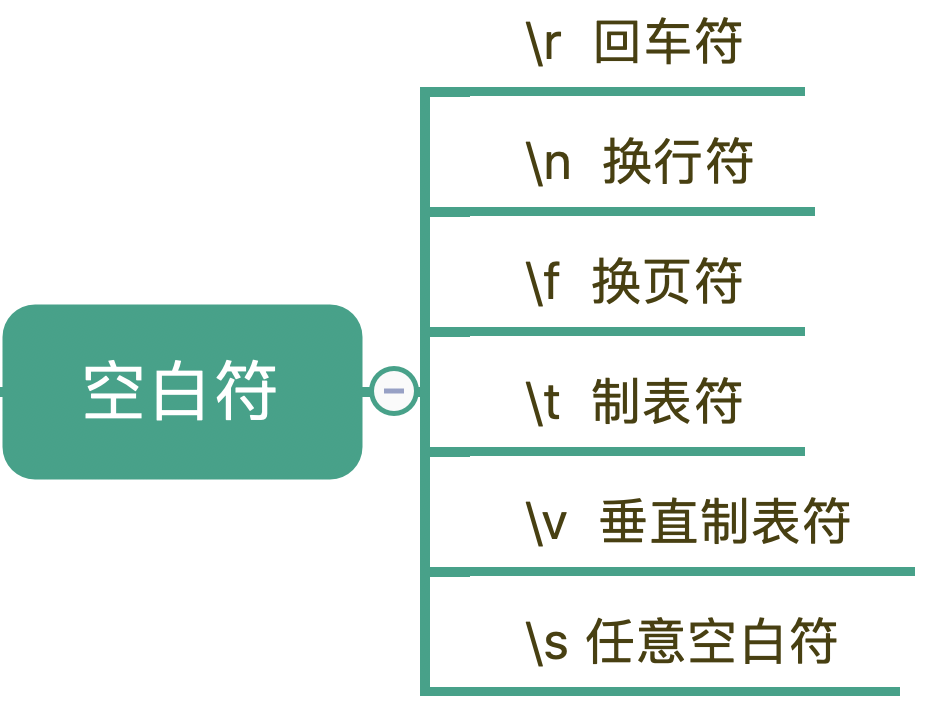 在正则中,也是类似于 \n 或 \r 等方式来表示空白符号,只要记住它们就行了。平时使用正则,大部分场景使用 \s 就可以满足需求,\s 代表任意单个空白符号。