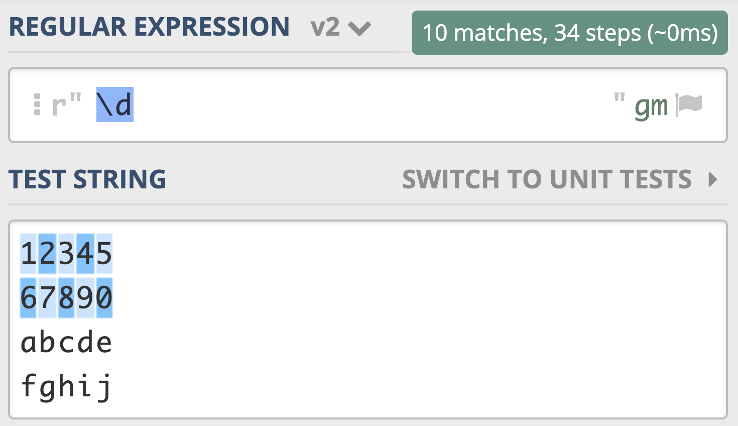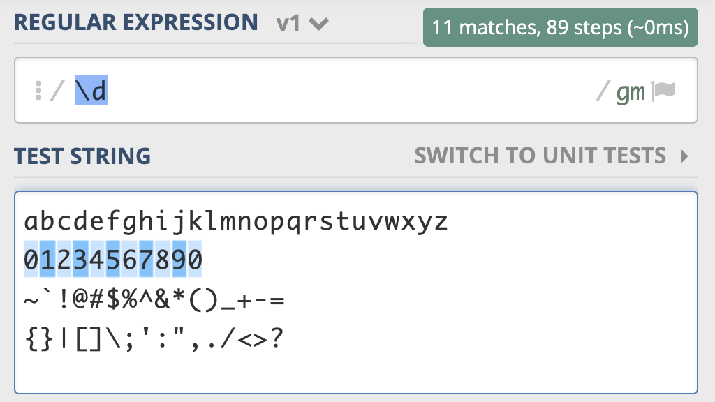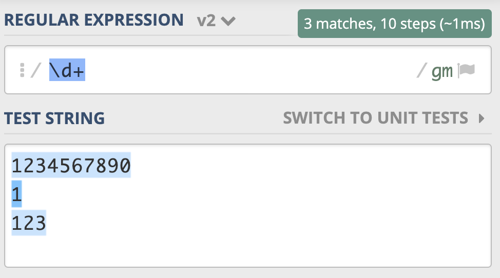 现在我们来看一下测试,我把常见数字,字母,部分标点符号作为文本,用 \d 去查找,可以看到只能匹配上10个数字。