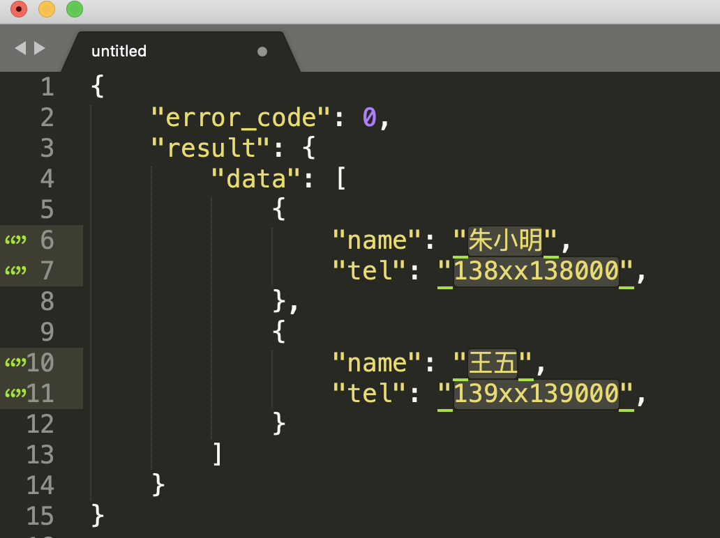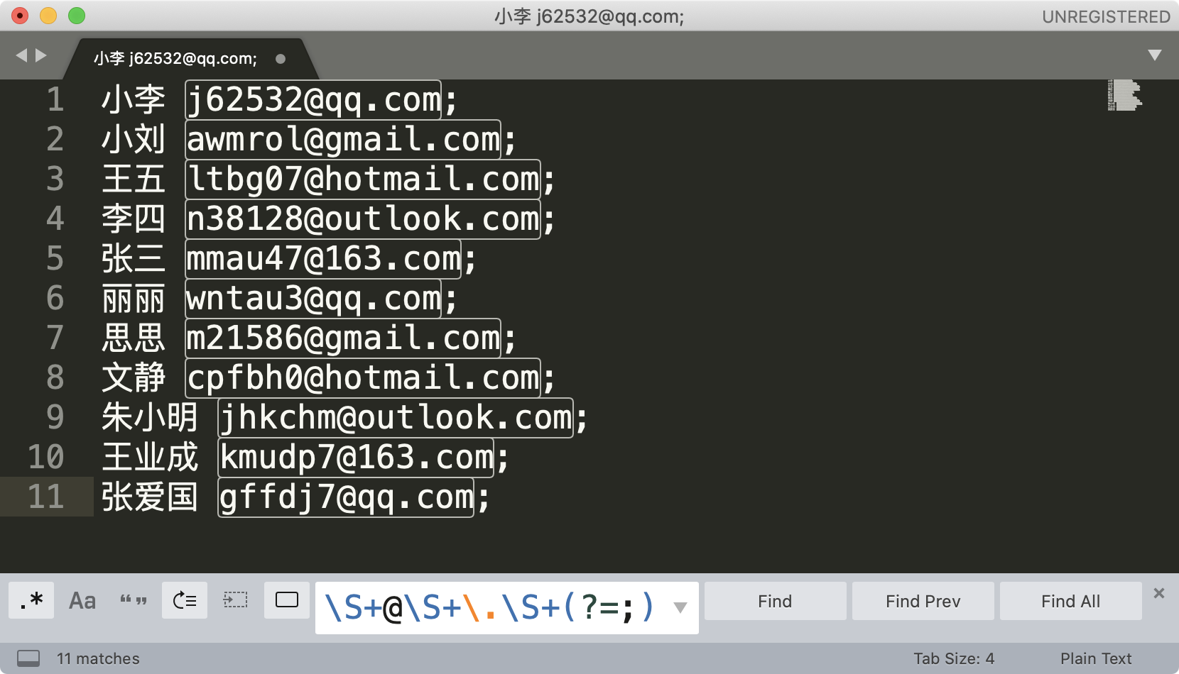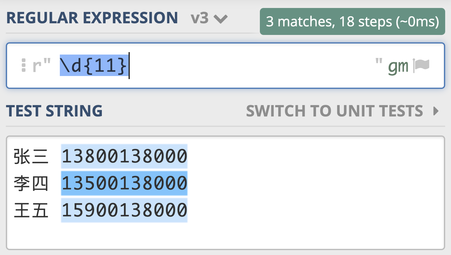 如果我们在后面再加上量词,就可以表示单个的数字出现了几次。比如 \d{11} 表示单个数字出现11次,即11位数字,如果文本中只有姓名和手机号,我们就可以利用这个查找出文本中的手机号了,如下图所示。