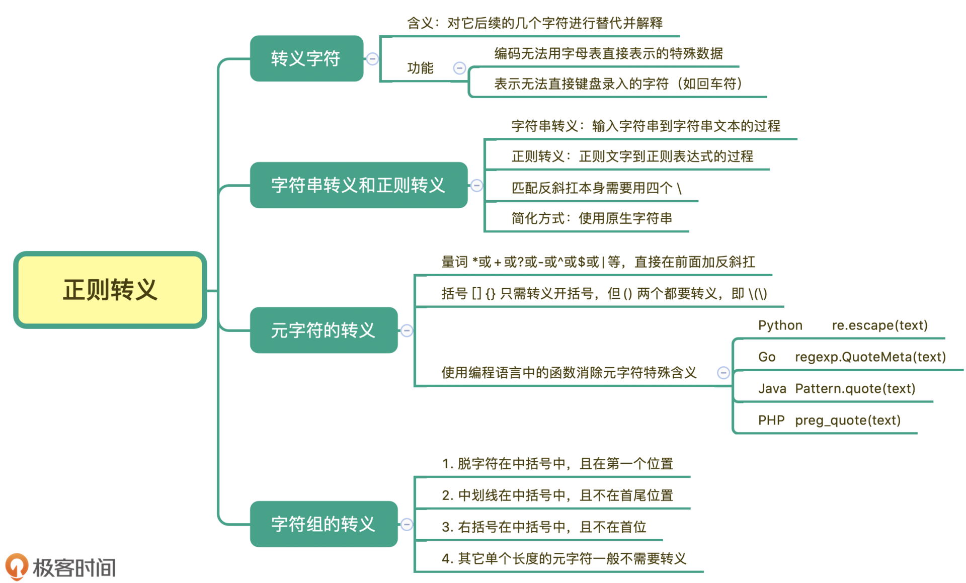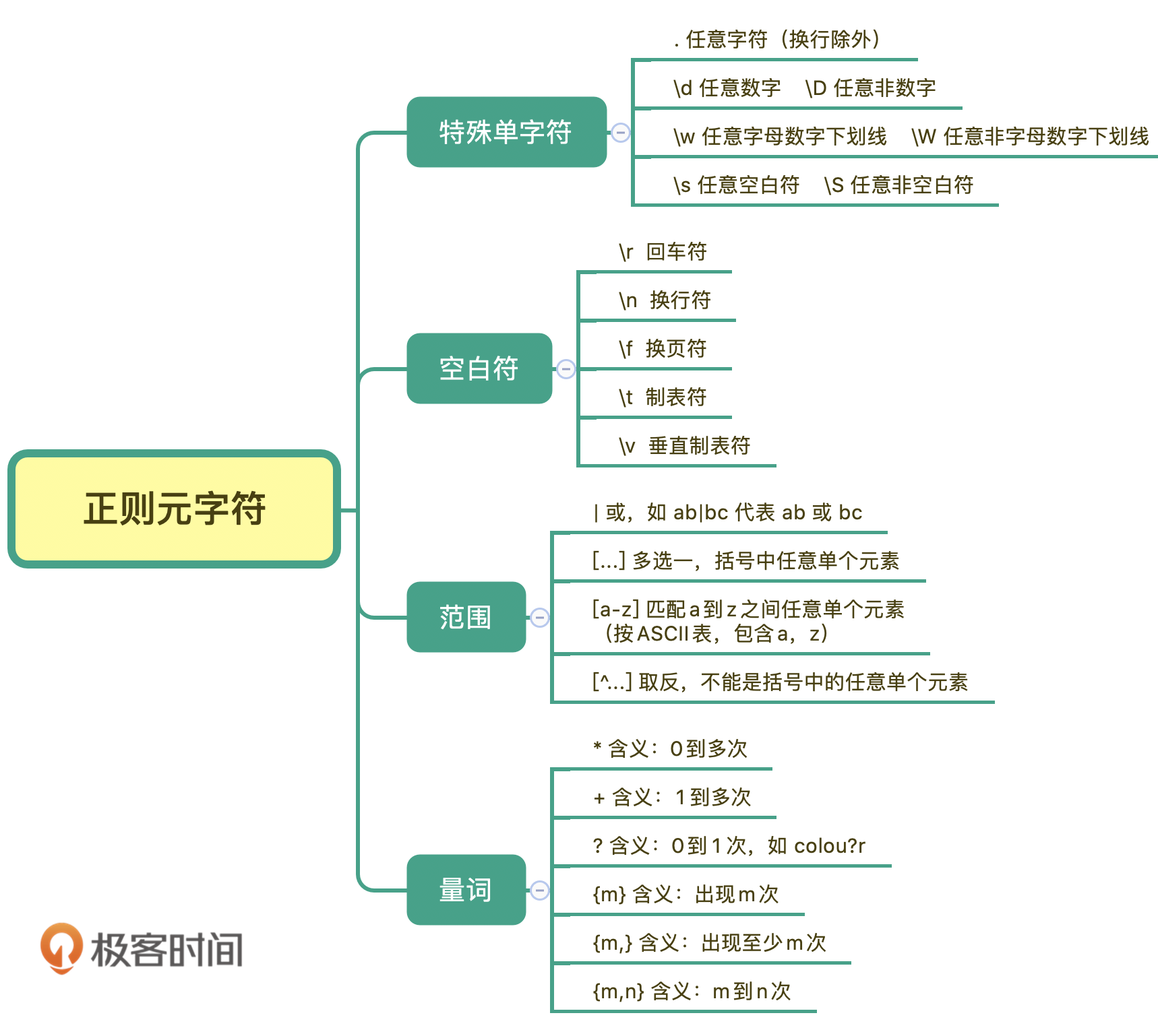 这里我给你介绍一个方法,就是分类记忆。元字符虽然非常多,但如果我们按照分类法去理解记忆,效果会好很多。事实上,这个方法不光可以用在记忆元字符上,也可以用在记忆各种看似没有章法的内容上。