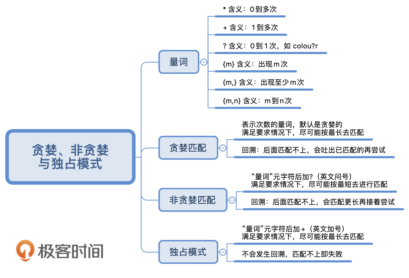 比如,正则表达式中的星号量词“ *”这一元字符,就是高级语言的处理逻辑“循环结构”的体现。具体来说,星号量词“ *”代表的是不定次数循环结构,而前后多个星号量词的嵌套就是多层不定次数循环结构的嵌套;或运算符,也就是竖线“|”这个元字符,就是高级语言的处理逻辑“分支结构”的体现;而用于分组的圆括号“()”,就相当于高级语言的作用域。
