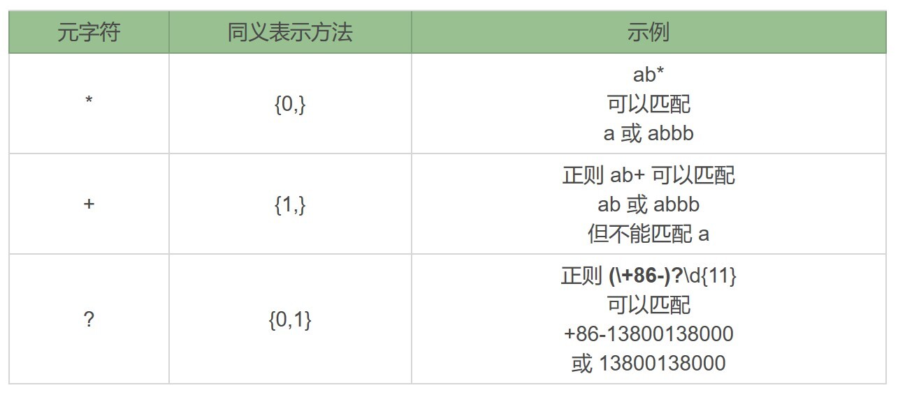 其中,由于连接结构最为普遍和常见,因此不通过元字符来表示,而是直接以前后顺序来表示;分支结构通过竖线元字符“|”这个或运算符来表示;而循环结构则通过量词元字符“ *”、“+”或“{n,m}”等来表示。