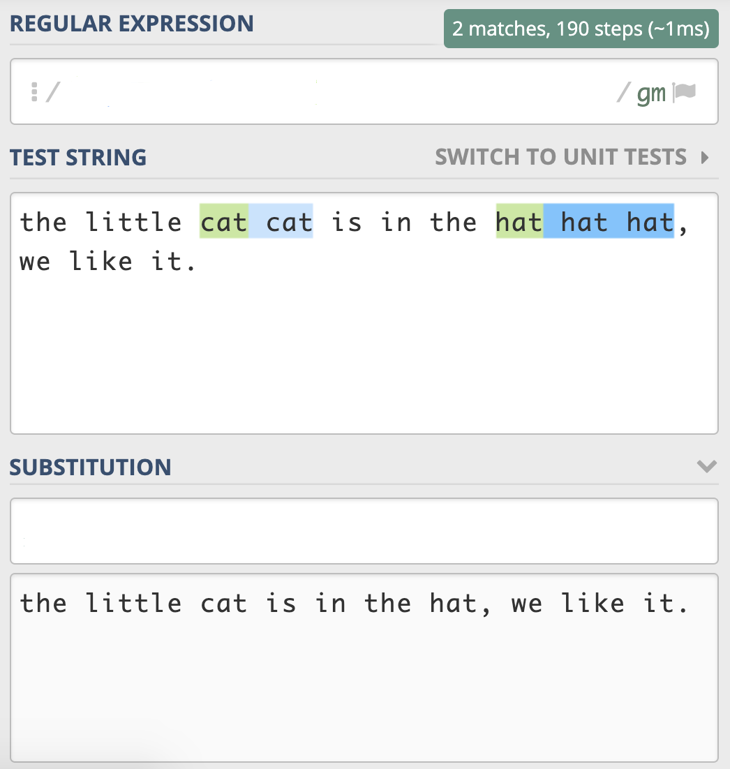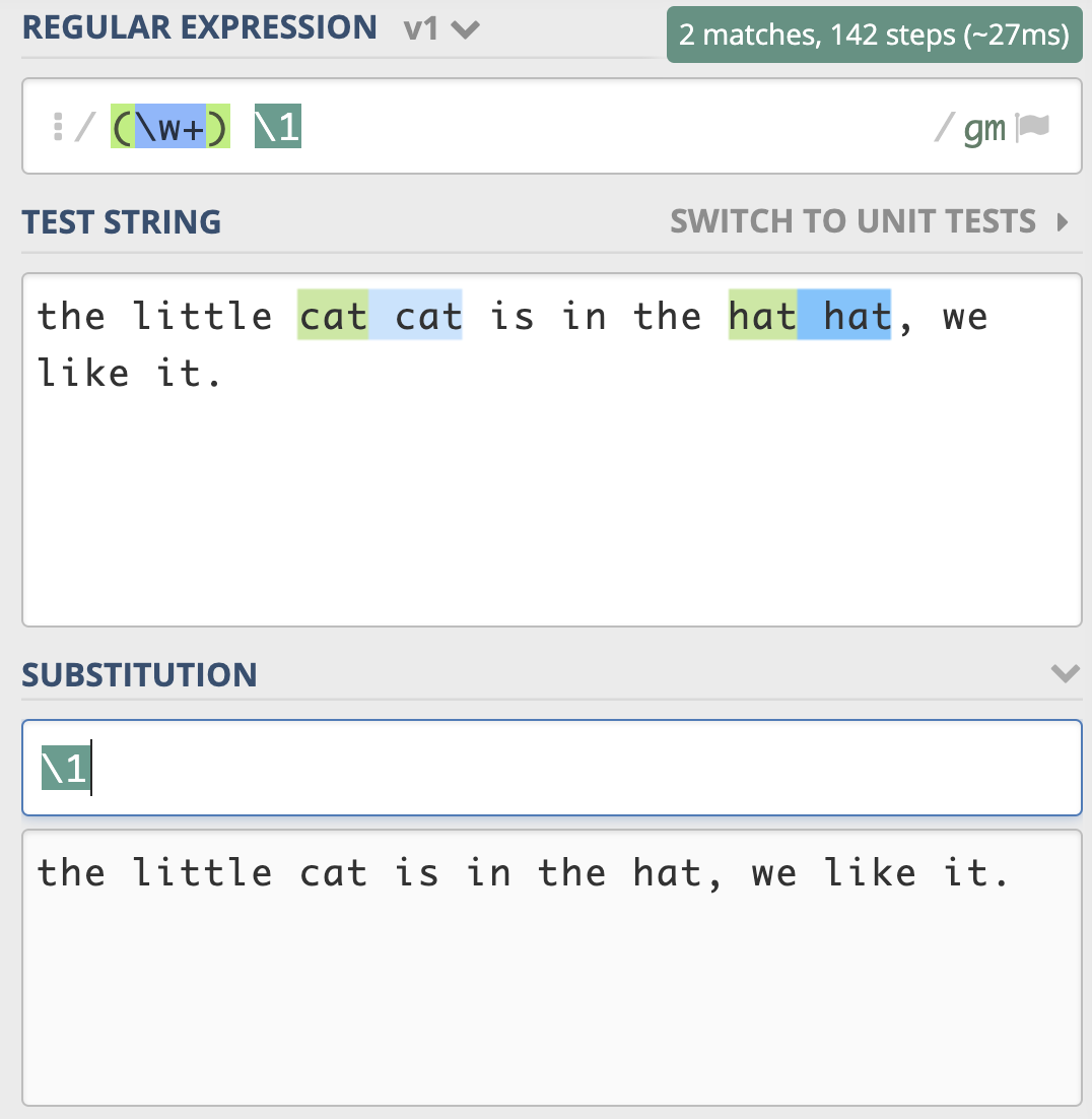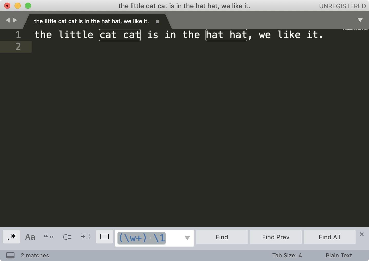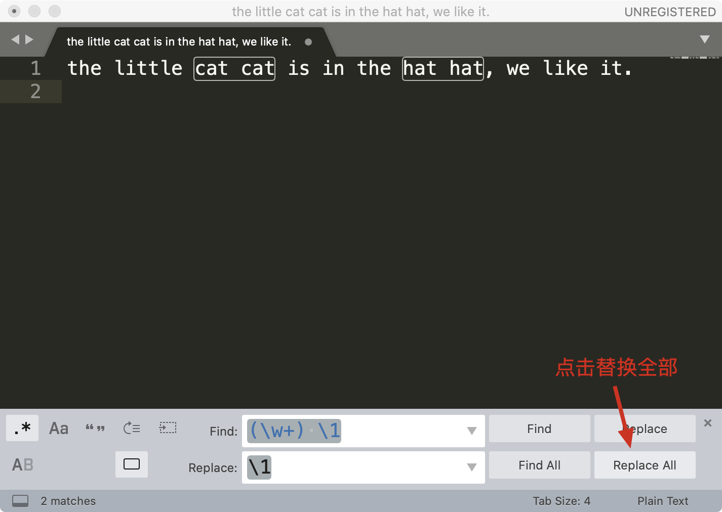 菜单中的 Find -> Replace,在查找栏中输入 (\w+) \1,在替换栏中输入子组的引用 \1 ,然后点击 Replace All 就可以完成替换工作了。这样,通过少量的正则,我们就完成了文本的处理工作了。是不是很方便呢?