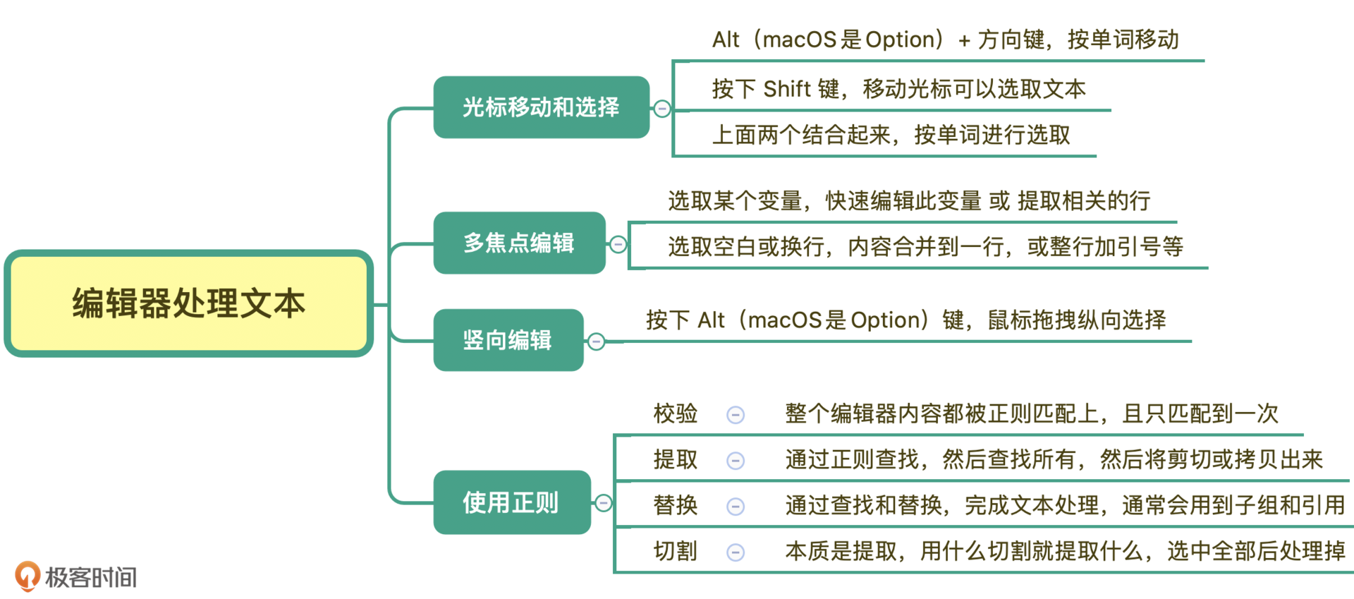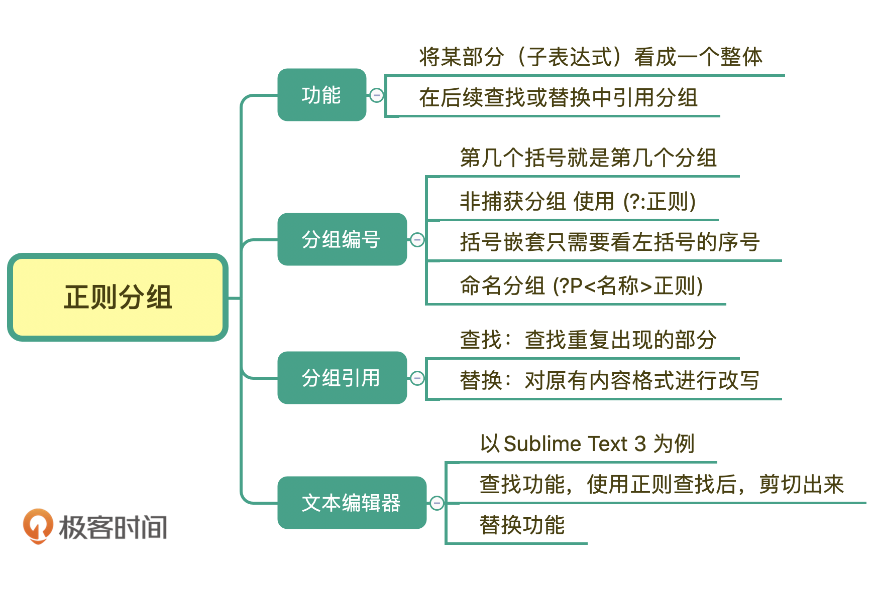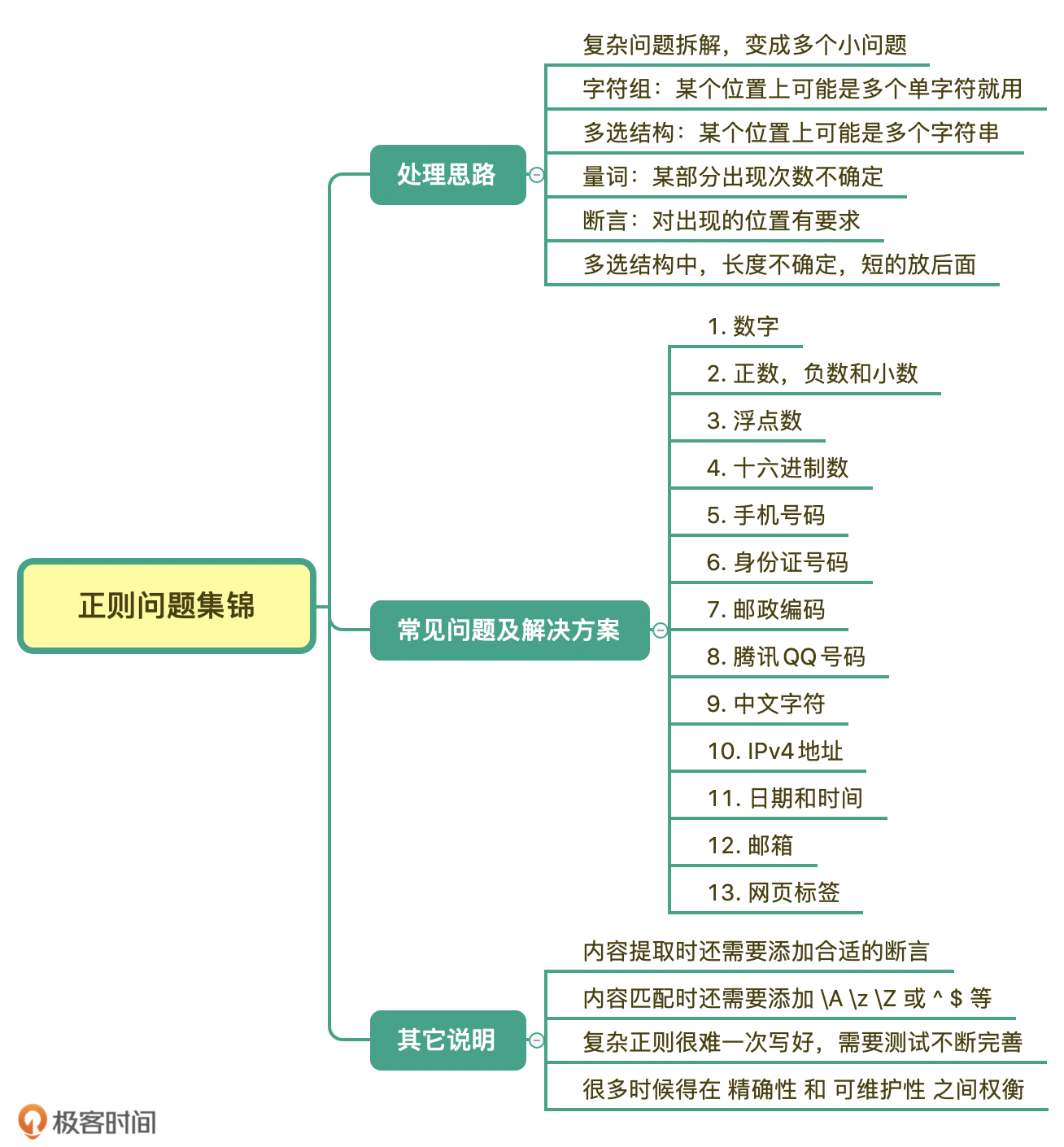 综合以上这三点,我希望你能掌握的是正则中一些重要的概念和功能,这是我们学习和使用正则的基础;然后是有关正则的记忆方法,通过合理的方式,事半功倍地达到学习效果,这是我们学习正则的利器;此外,我还会运用大量的示例让你了解正则在实际工作场景中的使用,只有与现实案例结合,我们的学习才不会脱节,这是我们学习正则的原则。