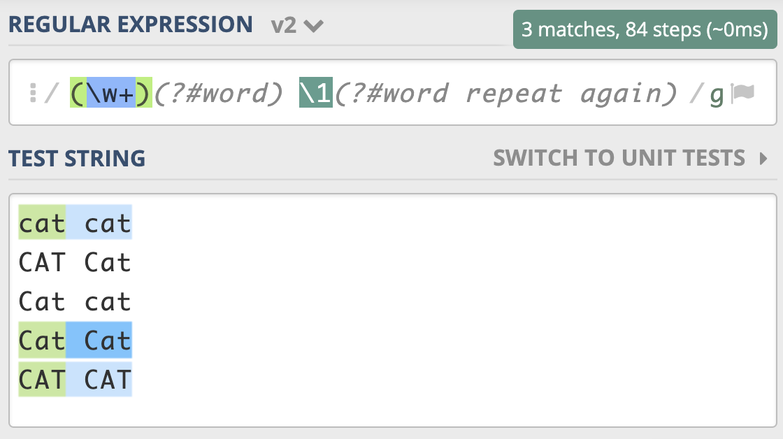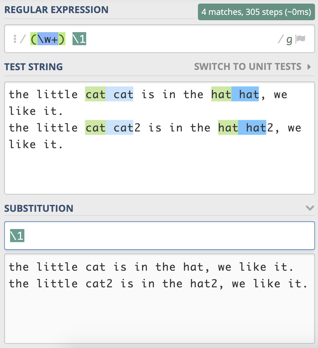 下面我用Python语言示例,从文本中找出连续出现的重复单词。我们可以看到,正则可以很方便地搞定这个需求。