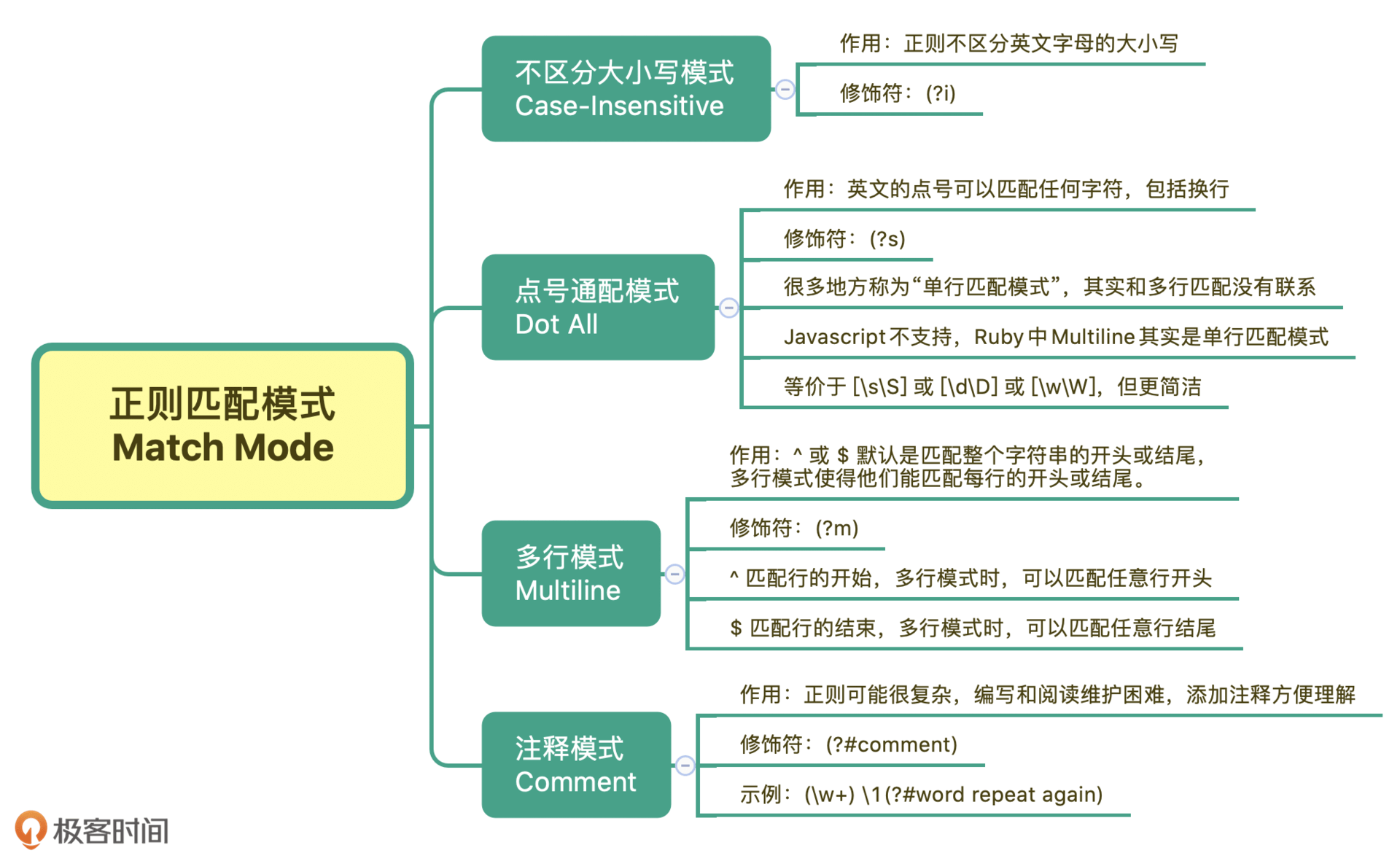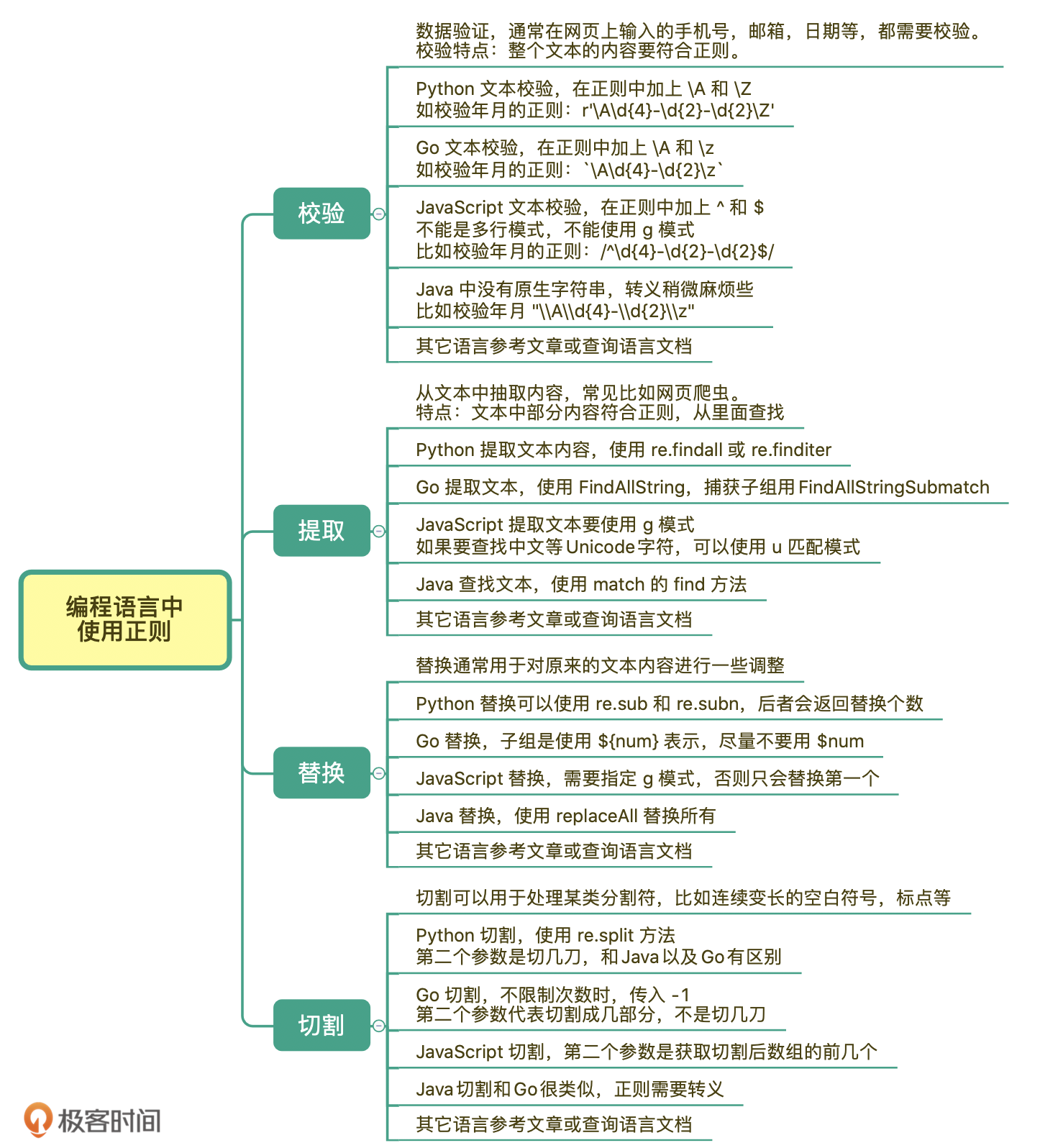 正则涉及的编程语言和工具非常多,我没有办法去完全讲完,因为那样专栏会变得比较琐碎。在我看来,咱们学习任何内容,在一开始时,都不要过分去注重细节,重要的是掌握正确的方法,先从整体上入手,掌握核心的概念。比如当你学习了字符组、多选结构、量词、锚点、贪婪&非贪婪、流派、匹配原理这些核心知识之后,你要在后续遇到问题时,查阅一下相关文档,很快就可以解决掉了。