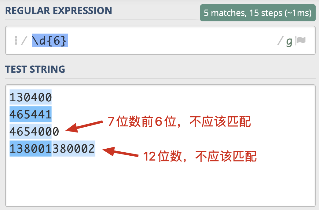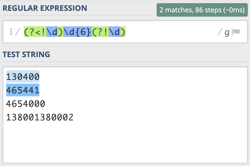 所以啊,不要总想着非得用正则来完成事情,也不要总是想使用一个正则来完成整件事情,如果你把一个正则拆分成多个正则更方便、更易于理解和维护,我们就拆成使用多个正则来完成。比如刚刚说的例子,我们可以先判断输入的内容是不是符合 \w{6}, 再判断里面是不是有连续的两位数字,这样通过分步解决会简单很多。