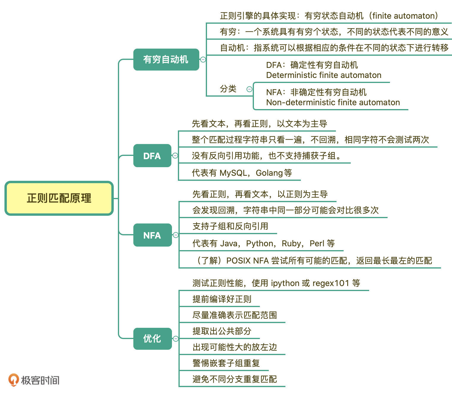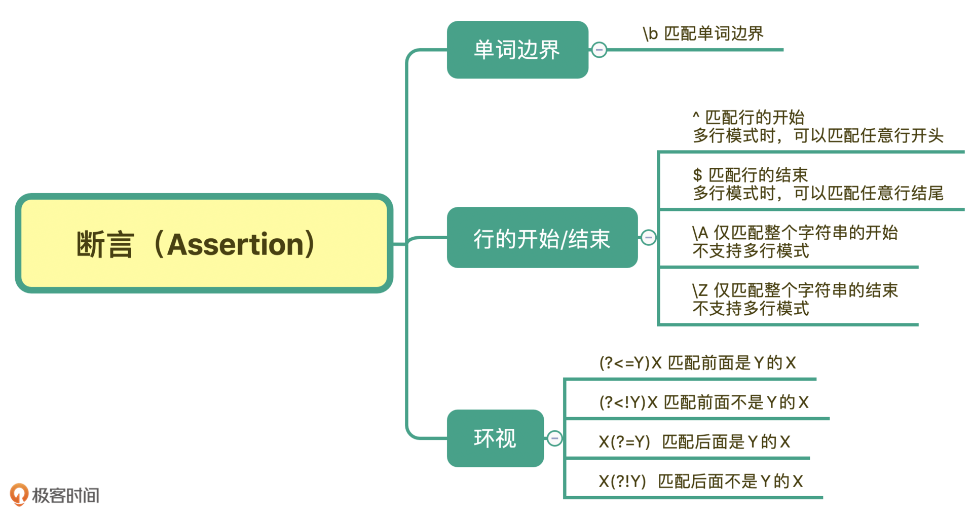 除此之外,我还会在课程中讲一些更高阶的正则内容,这部分主要有正则中的断言(包括单词边界、行开始和结束、环视),三种主要流派的区别以及对应的软件实现,正则的工作机制和常见的优化方式等。