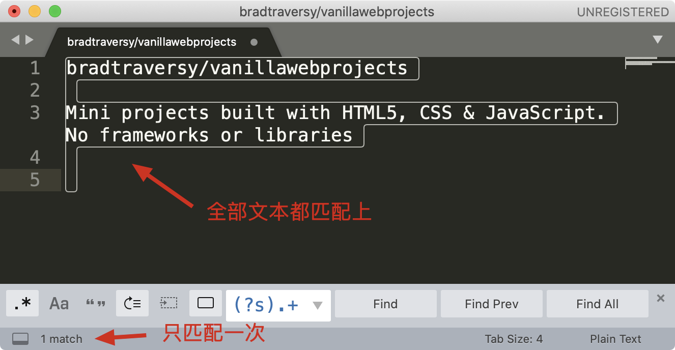 我们可以看到, \s 能匹配上各种空白符号,也可以匹配上空格。换行有专门的表示方式,在正则中,空格就是用普通的字符英文的空格来表示。