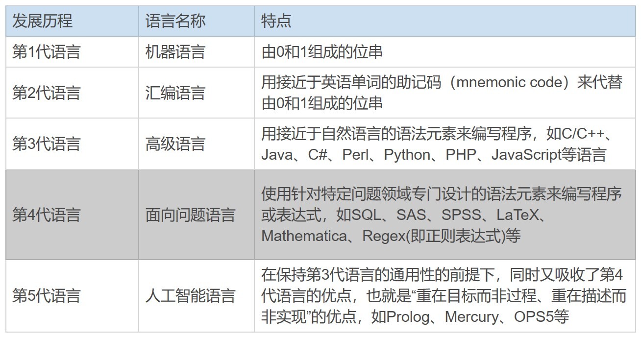 事实上,前面所说的第4代,面向问题的语言,基本上都属于声明式编程范式,而且往往也只支持声明式编程范式。声明式编程范式的主要特点就是,重在目标而非过程、重在描述而非实现,以声明式语句直接描述要解决的目标任务,专注于任务的分析和表达。声明式没有专注于处理逻辑和算法实现的过程,它具体的处理逻辑和算法实现是由语言解析引擎来负责的。