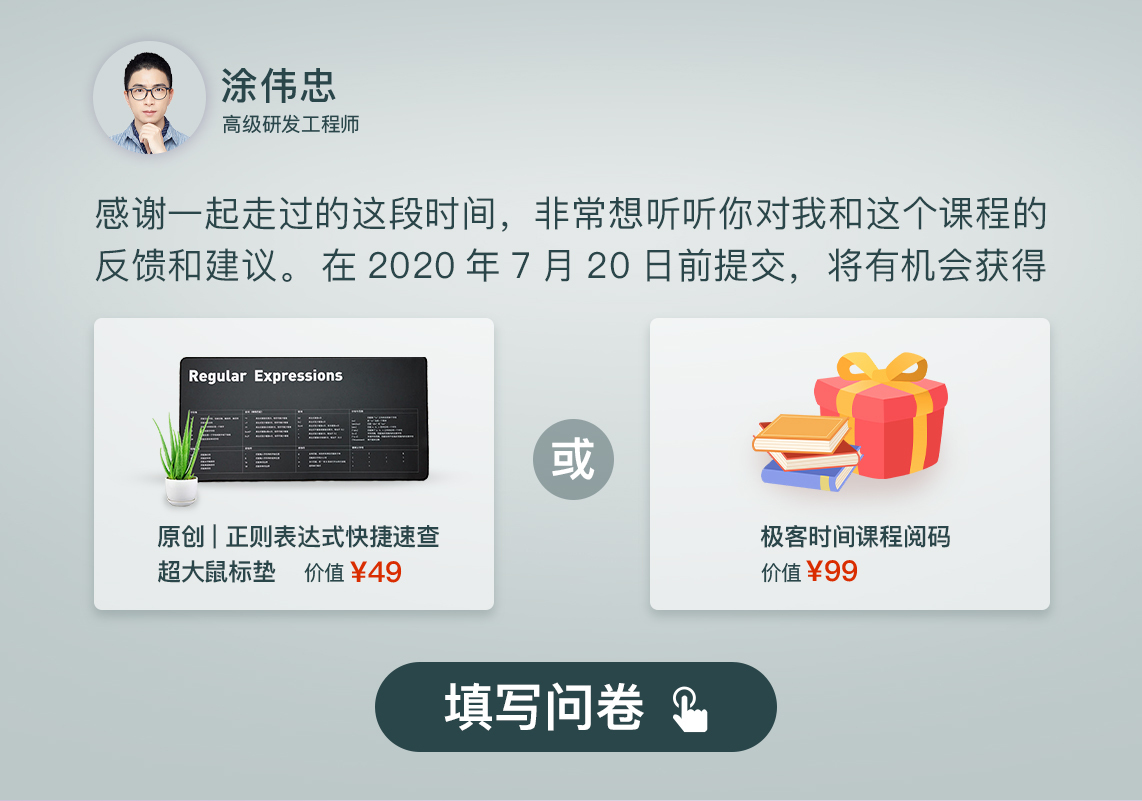 所以借着这个宝贵的机会,我想特别感谢所有参与这个专栏的同学,感谢你们一路的陪伴和坚持,借着这个机会,我也再和你唠叨唠叨,如何运用正则以及如何进一步成长。